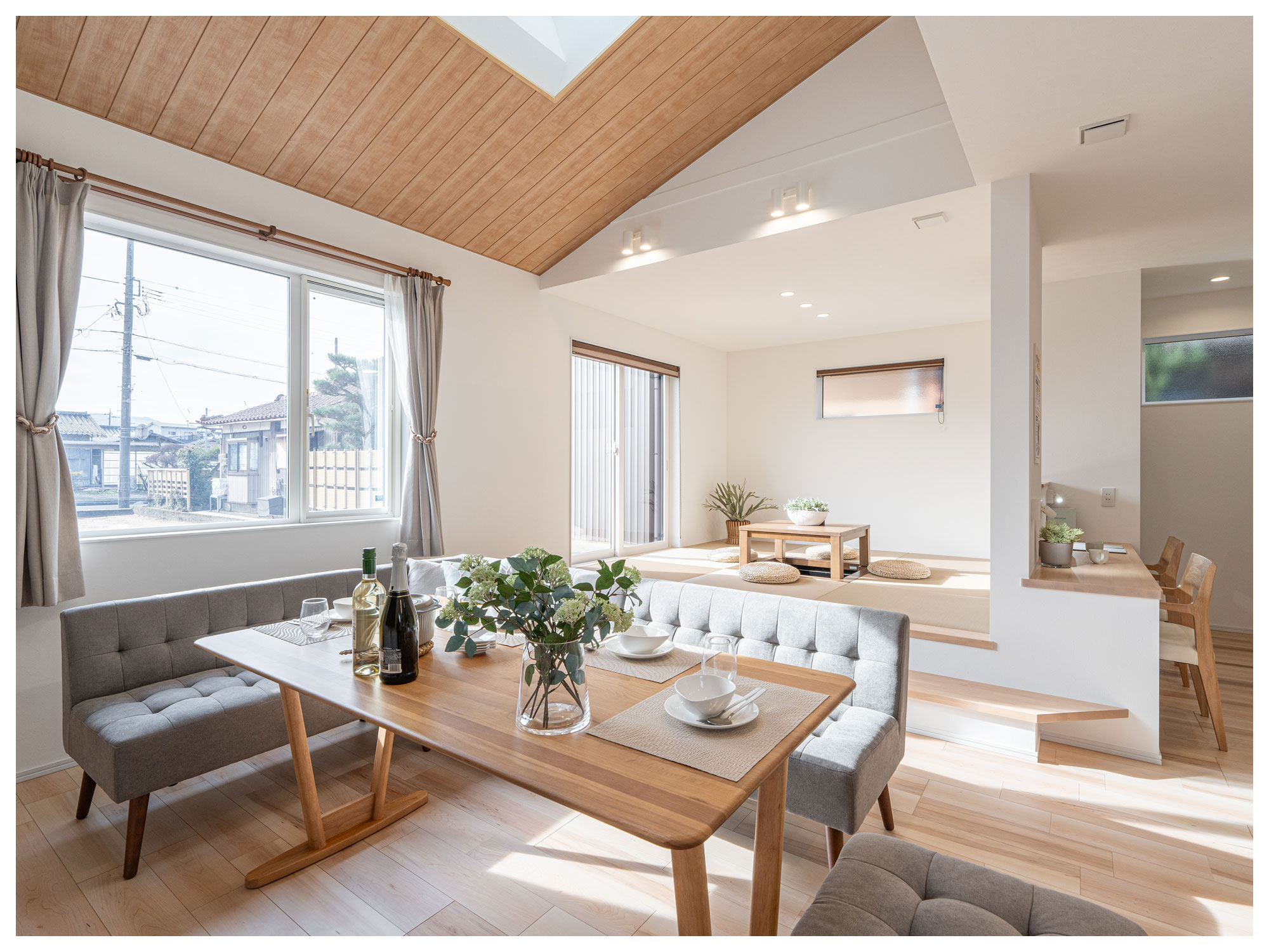 30帖超の大空間で、家族団らんも個の時間も充実。小上がりの畳コーナーは、赤ちゃんのお昼寝や遊び場に。キッチン前野カウンターは、子どものリビング学習にもぴったりです。