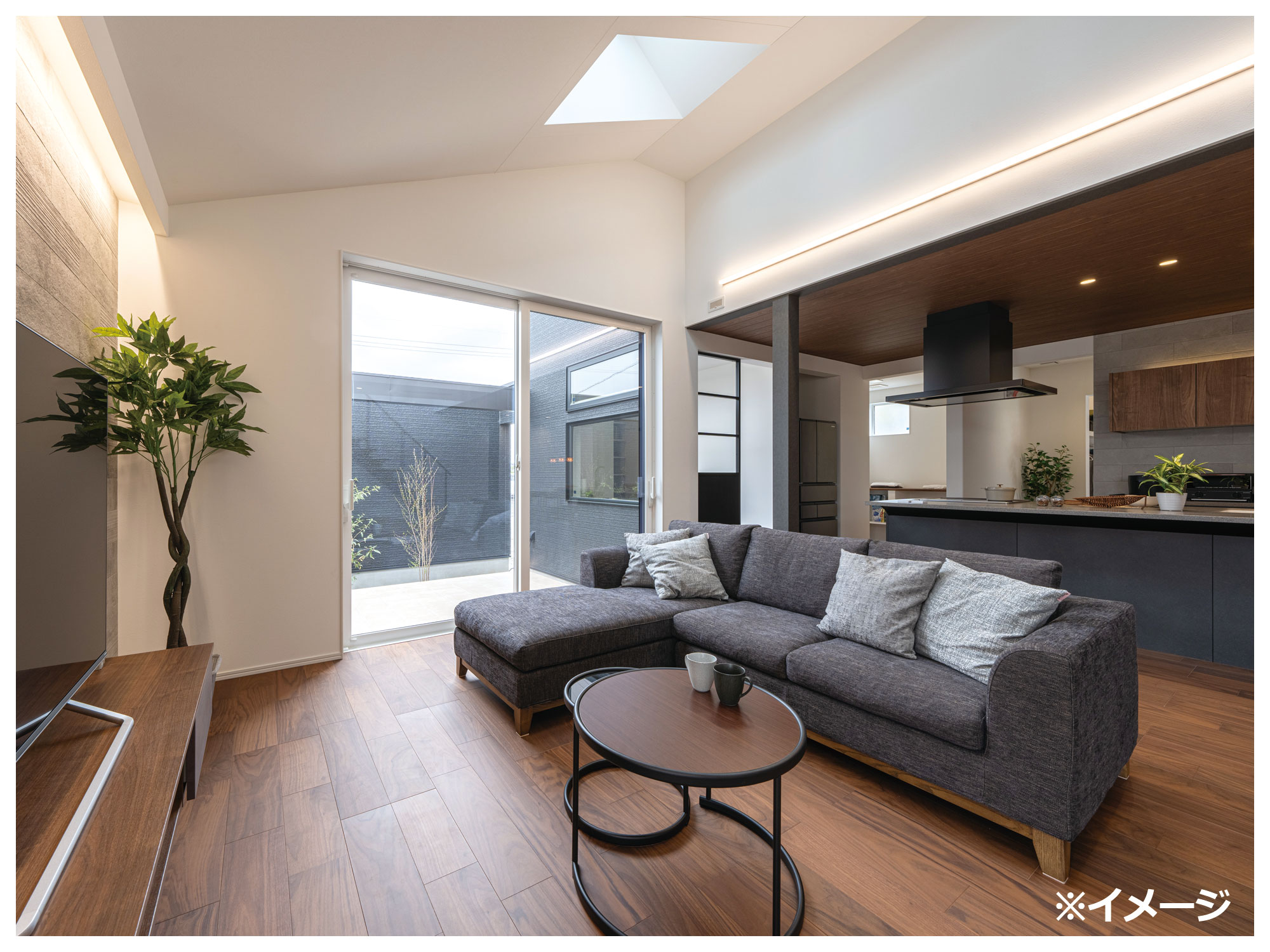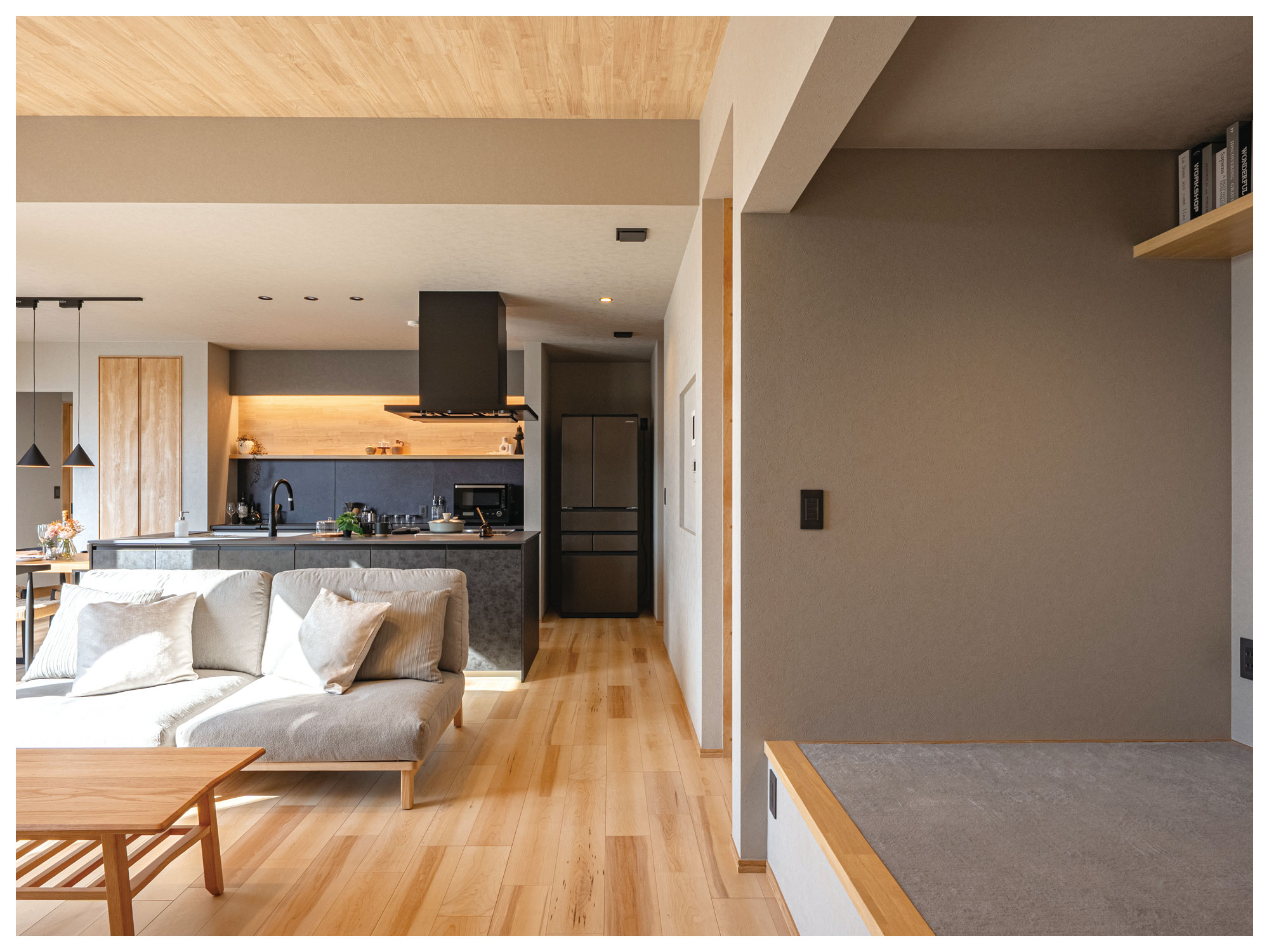 家族が自然と集まる暮らしの中心、大空間LDKは、大開口からウッドデッキへのつながり、BBQやガーデニングも楽しめます。また、ごろんと寝転がってくつろげる畳コーナーやキッチン横のカウンターデスク等、家族の時間を豊かにする工夫を随所に取り入れました。