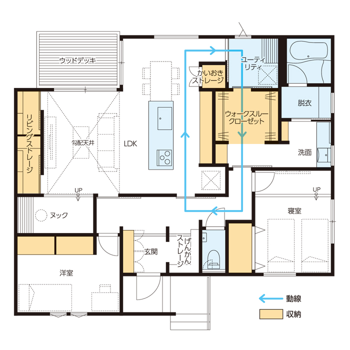 また、空間に奥行きが生まれる勾配天井やヌック、